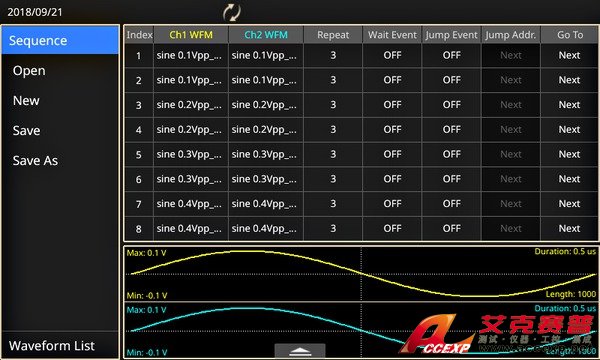 高級模式是 AFG31000 中提供的新模式,可以生成多個復雜定時的波形。在這種模式下,您可以編寫一個由 1~256 個波形組成的列表(或序列),總波形長度可達 16Mpts/ch (128Mpts/ch 選配),并定義這些波形的輸出序列。支持重復、轉(zhuǎn)到、等待、跳轉(zhuǎn)和已觸發(fā)事件,大容量內(nèi)存可以存儲許多波形或長波形。